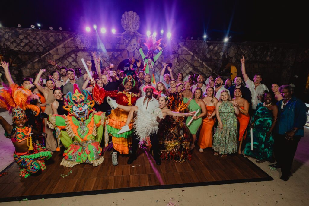 We were standing on stage in a Roman-style amphitheater. Cold sparks were firing behind us. A full Dominican carnival troupe called “La Hora Loca” was crashing the dance floor with stilt walkers, drums, glow props, and a conga line that refused to end.