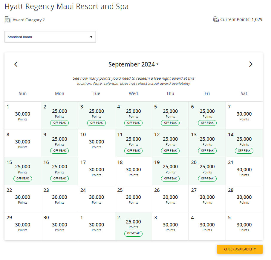 This will lead you to the points calendar, which will show you pricing per night for your stay, and you can look up to about 1 year out.